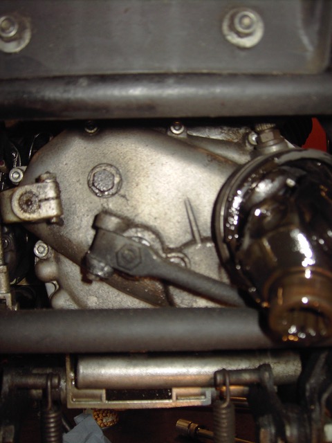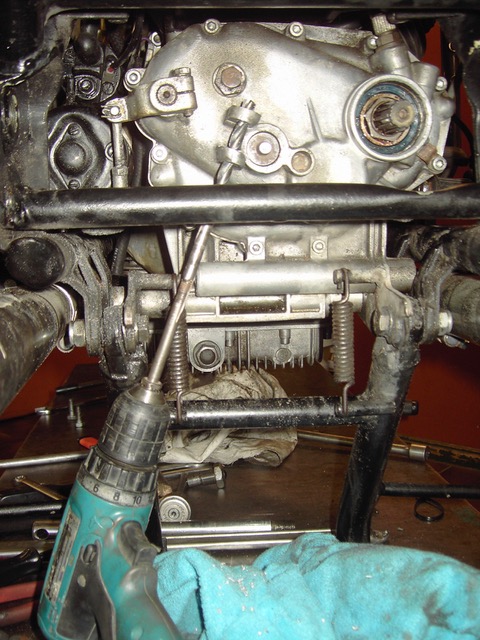 Volgende lekkage kwam uit de versnellingsbak, met name uit de achterste bakkeerring en de ingang van koppeling-druktafel. Om deze items te vervangen wordt de swingarm en koppelingshevel gedemonteerd . Maar…….er zat zeer veel speling op de koppelingshevel, die met een vast geroeste gaffelpen klem zat in het achterdeksel. Hierdoor de hevel er tussen uit moeten slijpen met een Dremel . Vervolgens doorboord voor een grotere maat gaffelpen.