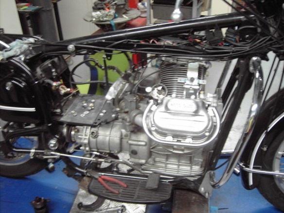 Ook stond deze motor voorover gebukt.Dit kwam doordat de originele lineaire voorvorkveren uit 1972, door materiaal moeheid in elkaar waren gezakt.Als vervanging stel progressieve veren uit Italie betrokken.Die hebben ook nog als bijkomend voordeel, dat de veer steeds stugger word bij het inveren van de voorvork.